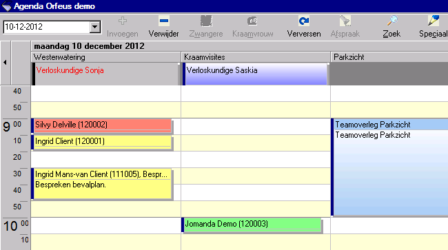 Wat kun je allemaal met de Agenda functie van Orfeus? Met een goede inrichting van je agenda wordt de praktijkvoering veel makkelijker. Er zijn meerdere agenda’s mogelijk voor verschillende locaties en voor meerdere gebruikers. Verder kun je eenvoudig overzichten maken uit de agenda, bijvoorbeeld voor je planning. De agenda kun je altijd op elke willekeurige plek inzien. Het is mogelijk om vanuit de agenda afdrukken te maken en groepsmails te verzenden. Omdat er meerdere agenda’s naast elkaar draaien kan er bijvoorbeeld een agenda ingericht worden speciaal voor de kraamvisites, de praktijkassistente, voor ieder spreekuur en desnoods voor iedere verloskundige.
